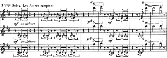 At the same time, three solo violins are playing three different sets of harmonic notes, simultaneously, which simulate the sound of a single bird whose tone includes multiphonics (more than one pitch sounding at a time).