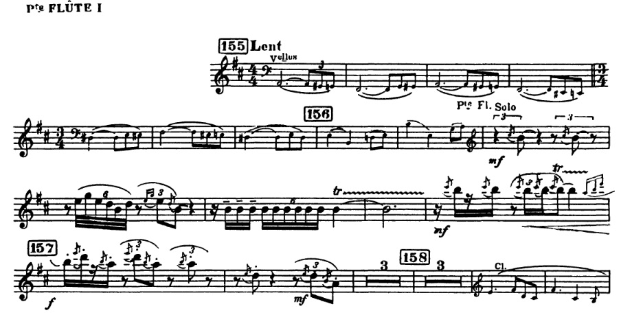 Here’s an excerpt of the piccolo part (petite flute 1)1: The player begins playing in the third bar after figure 156 (the small notes before that are cued cello notes, to help the performer know when to come in). It would sound an octave higher than written. In this section, we can see grace notes, flourishes, repeated notes and trills; four effects that composers have traditionally used to recreate birdsong: