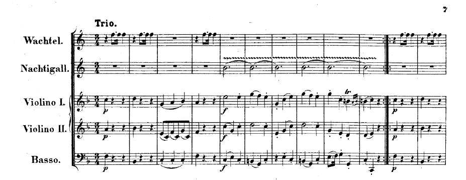 The clue was probably in the fact that Beethoven names the birds in his score. In the flute line we read “Nachtigall” (nightingale), the oboe is labelled “Wachtel” (quail), and the clarinets are the “Kukuk” (cuckoo) [1].